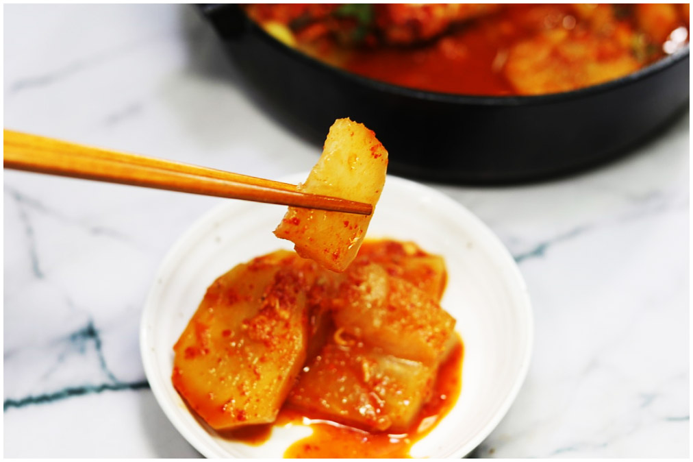 갈치조림 3-2. 무는 오래 끓일수록 깊은 맛이 우러나온다. 그러니 얼마든지 더 끓여줘도 상관없다. 다만 끓일수록 물의 양이 줄어드니 물 1컵 정도를 미리 더 준비해뒀다가 국물이 부족해지면 넣도록 하자.