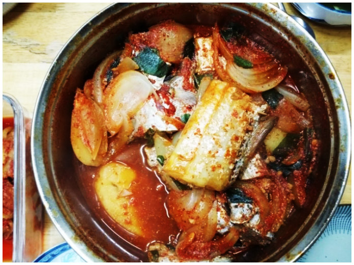 갈치조림 5-1. 양파와, 대파, 고추 같이 무른 채소들의 경우에는 끓이던 중간에 넣어주면 된다. 귀찮다면 그냥 재료를 넣을 때 다 같이 넣어도 무관하다.