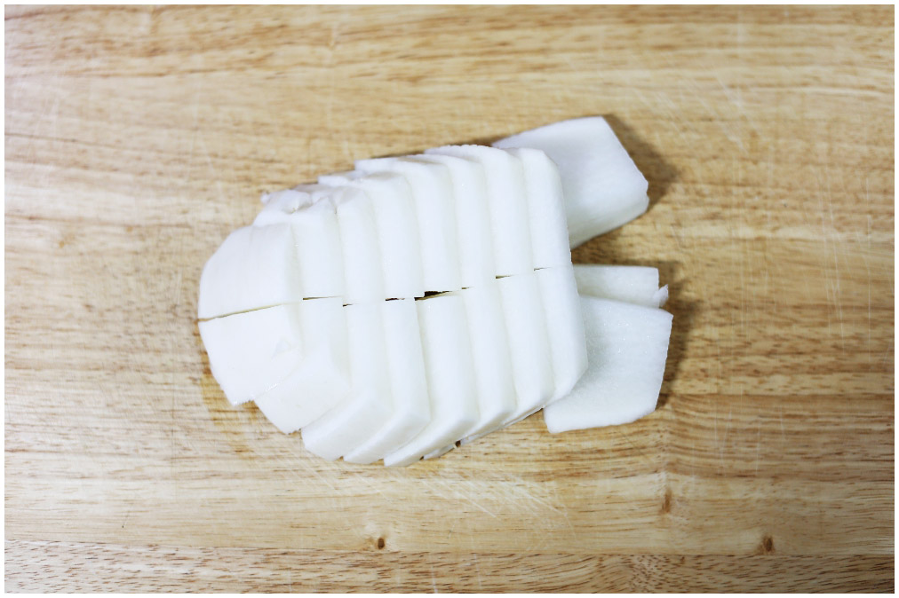 갈치조림 2. 무를 손질해주도록 하자. 깨끗하게 세척하고 혹시나 상처 난 부분이 있다면 도려내고 무를 종이컵 반 정도의 굵기로 자른 다음 반 정도만 썰어서 준비해주도록 하자. 자신이 원하는 다른 모양이 있다면 그렇게 썰어도 상관없다.