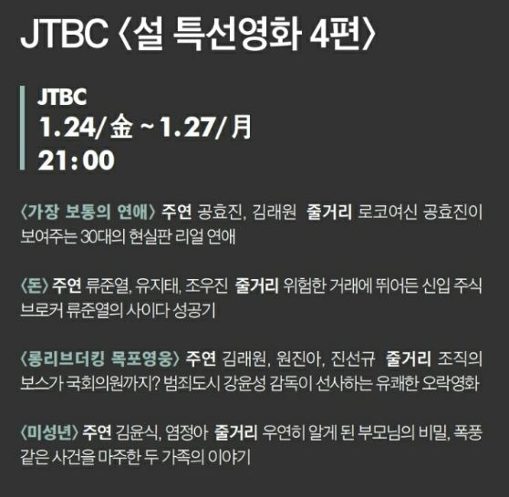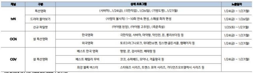 그다음으로 살펴볼 방송사는 JTBC의 설특선 영화 편성표이다. JTBC는 1월 24일 부터 1월 27일까지 오후 9시 매일 같은 시간에 가장 보통의 연애, 돈, 롱리브더킹 목포 영웅, 미성년이 순서대로 방송될 예정이라고 한다. 마지막으로 OCN과 CGV를 살펴보려고 하는데 이 두 방송사는 워낙에 많은 영화를 상영할 예정이라 별도의 사진을 통해서 편성표를 올릴 예정이니 사진을 참고하길 바란다.