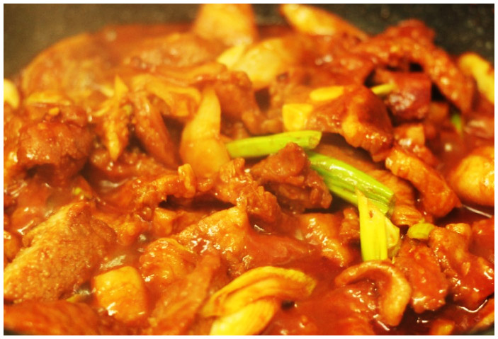 돼지고기 두루치기 9. 국물을 조리듯이 볶아준다. 국물이 거의 없는 수준으로 볶아주면 된다. 그다음 청양고추와 대파를 넣어준다.