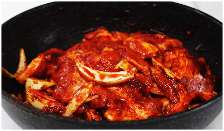 돼지고기 두루치기 5-1. 설탕을 미리 뿌려두는 이유는 설탕 입자가 고기 내부까지 잘 스며들어서 나중에 맛을 더욱 증진시킬 수 있기 때문이다.