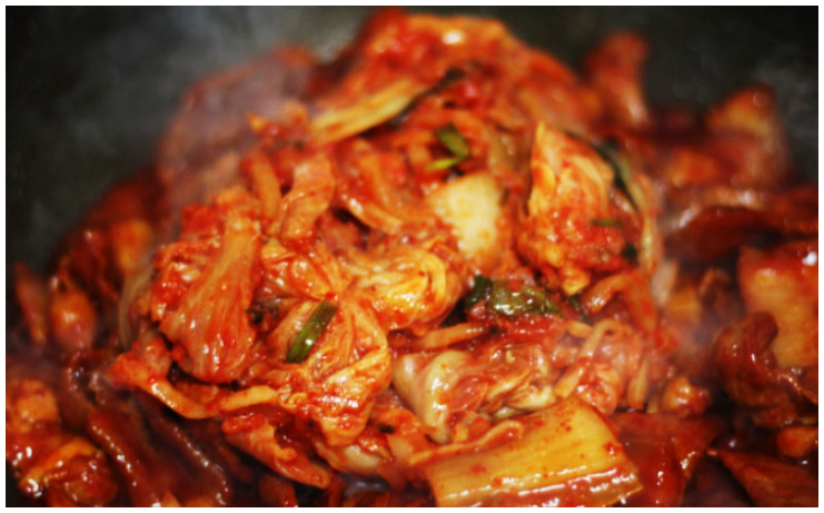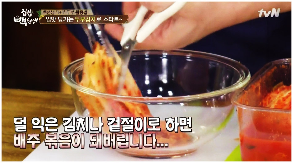 돼지고기 두루치기 2-1. 김치를 썰을 때 도마에 올려둔 다음 칼로 자르지 말고 볼에 담아 가위로 손질하면 뒷정리를 줄이고 도마의 변색도 막을 수 있다.