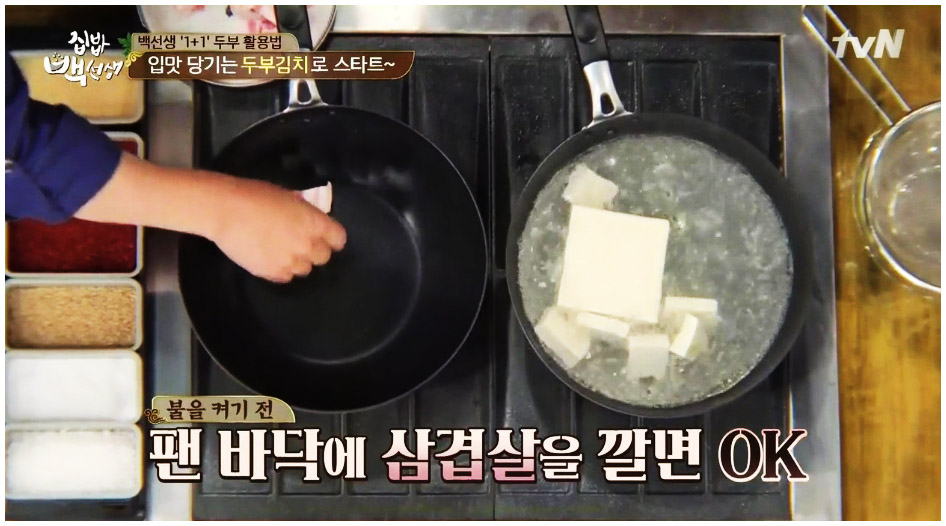 돼지고기 두루치기 4. 재료들이 준비되면 팬을 미리 달궈준다. 달궈진 팬에 식용유 2스푼을 둘러 돼지고기를 구워준다.