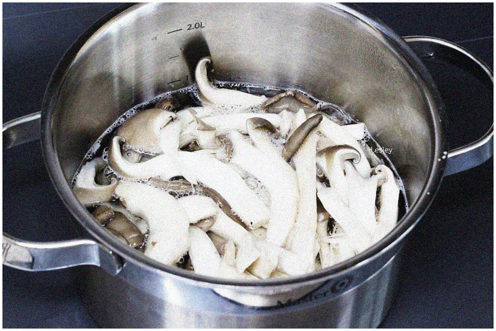느타리버섯 볶음 2. 다른 재료를 준비하기 전에 먼저 느타리버섯을 데쳐주도록 하겠다. 5컵 정도의 물을 냄비에 담아 소금 1스푼을 섞어 끓여준다. 물이 끓어오르기 시작하면 느타리버섯을 넣고 30초 정도 기다렸다가 빼서 찬물에 헹궈준다. 헹구는 과정까지 완료된 느타리버섯은 꼭 짜서 물기를 제거해준다.