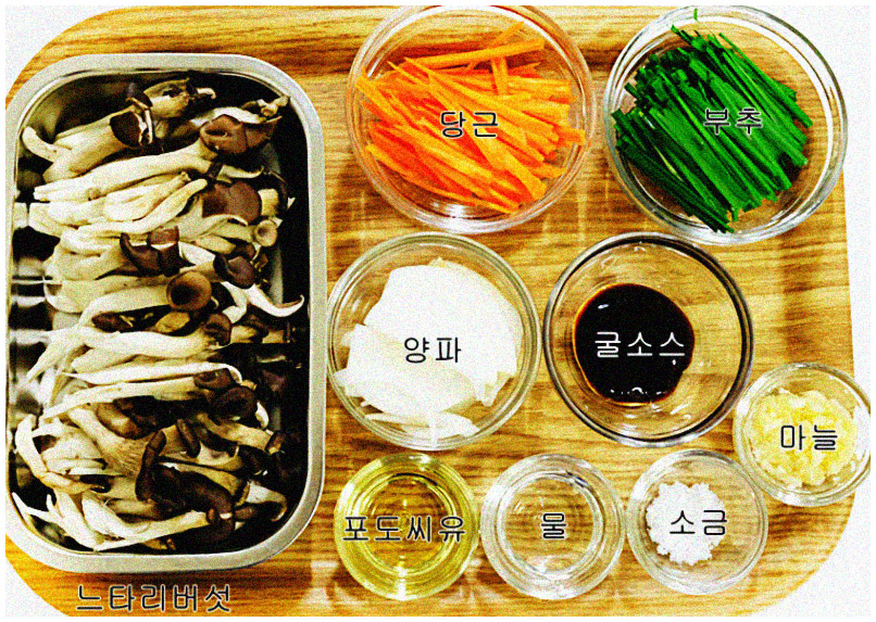 재료 : 느타리버섯 1팩 혹은 3컵(밑둥을 제거하고 가닥 별로 손질된 상태의), 양파 반개, 당근 1/3개, 대파 1대, 다진 마늘 1스푼, 간장 1스푼, 굴소스 반 스푼, 참기름 1스푼, 소금 1스푼, 후추 약간, 식용유 2스푼