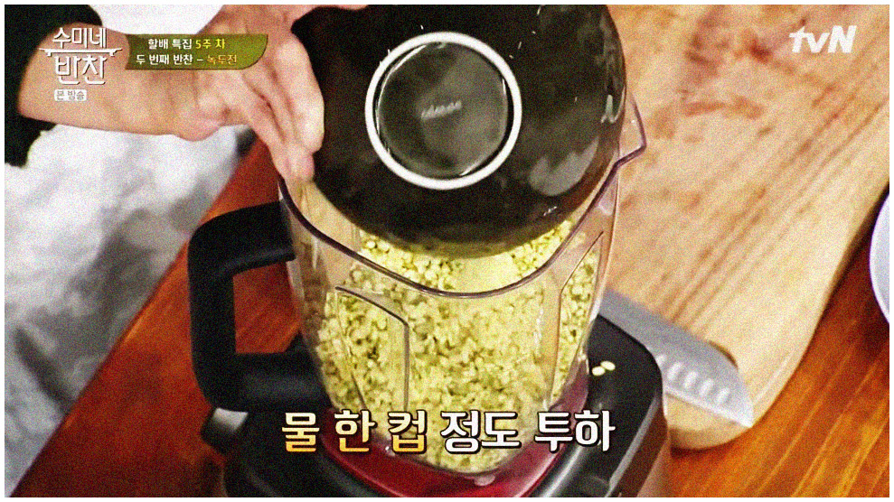 녹두전 만드는 방법 9. 이쯤 되면 녹두와 쌀이 잘 불어있을 것이다. 녹두와 쌀을 불리는데 쓰는 물을 최대한 제거해준 다음 믹서에 넣어서 함께 갈아주도록 하자.