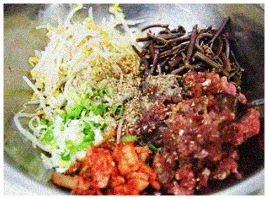 재료 : 녹두 2컵, 쌀 반컵, 다진 돼지고기 반 컵, 다진 김치 반 컵, 다진 고사리 반 컵, 다진 숙주 반 컵, 대파 반대, 양파 반개, 소금 약간, 후추 약간, 참기름 반 스푼, 다진 마늘 반 스푼