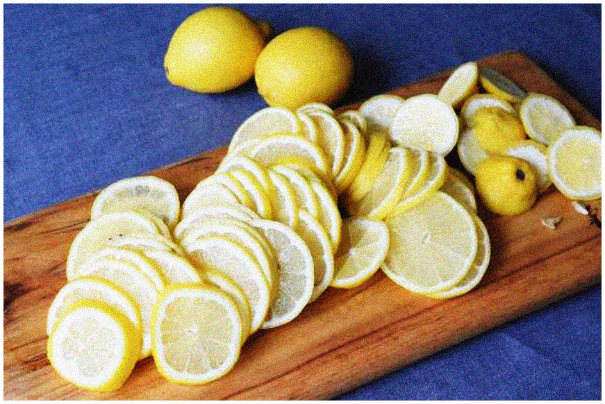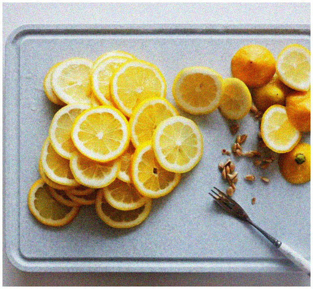 레몬청 만들기 6. 꼭지가 제거된 레몬은 중간 심지가 가운데로 가도록 얇게 썰어주도록 하자. 레몬을 자르면서 나오는 씨앗은 모두 제거해줘야 한다.
