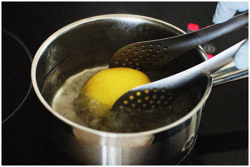 레몬청 만들기 4. 끓는 식초물에 레몬을 5초정도만 담갔다가 바로 빼준다. 그다음에는 바로 찬물에 담가서 열기를 식혀주도록 한다.