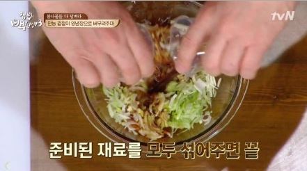 백종원 봄동겉절이 만드는 법의 완성은 이제 거의 80%정도 끝났다고 생각하면 된다. 겉절이의 특성상 따로 조리를 필요로 한 것도 아니고 모든 재료를 준비해 뒀다면, 그리고 재료들로 양념장을 만들고 봄동을 손질해 놨다면 봄동을 먹기 좋은 크기로 적당하게 자르고 양념장, 참기름과 함께 버무리면 끝이기 때문이다.