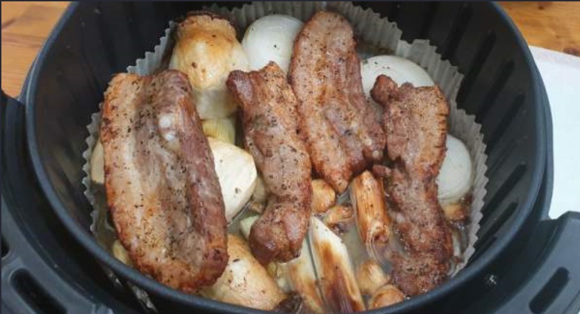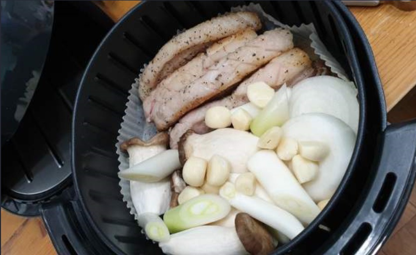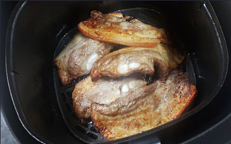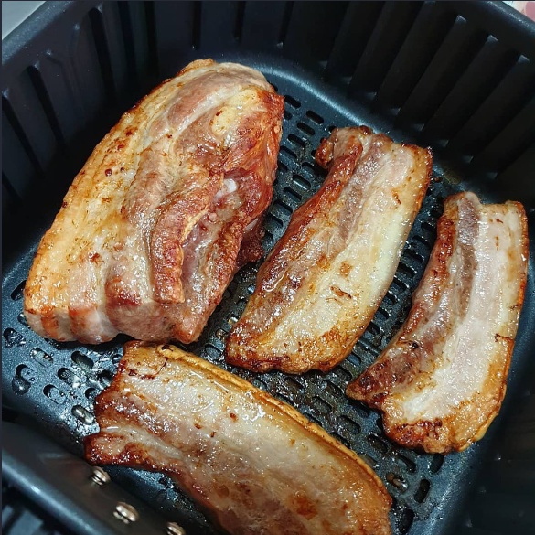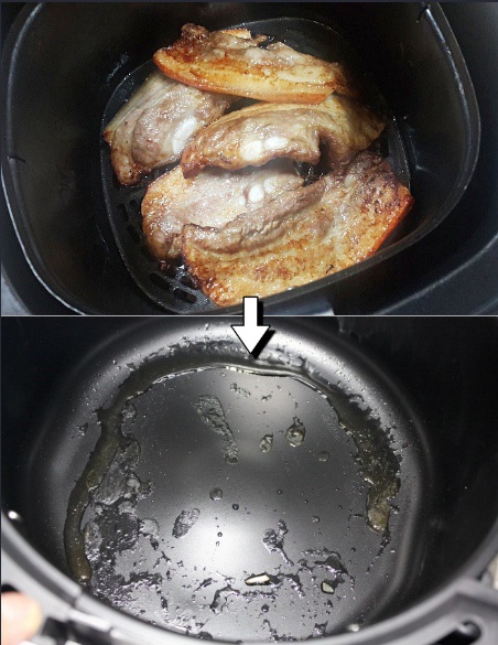 삼겹살을 에어프라이어로 조리할 때 만약 생고기라면 상관이 없겠지만 냉동이었다면 핏물이 올라와 하얗게 고기주번에 늘러 붙는 상황이 생긴다. 그리고 이런 현상에서 에어프라이어는 편하면서도 애매하게 편한 환경을 만들어준다. 에어프라이어는 항상 바닥 받침이 있는데 이게 구멍이 뚫려있어서 기름기나 그런것들이 아래로 떨어져서 고기를 담백하게 구울 수 있도록 해준다. 그런면에서 삼겹살에 나오는 하얀 이물질이 그 아래 바닥으로 떨어지기 때문에 불쾌함은 덜 수 있다. 다만 바닥 판에 나 있는 구멍들 안쪽으로 늘러 붙은 하얀 이물질들은 설거질 하기가 상당히 귀찮은 편이다. 그나마 판 밑에 종이호일이라도 깔아 두면 나중에 치우기가 조금이라도 편해지니 꼭 깔기를 바란다.