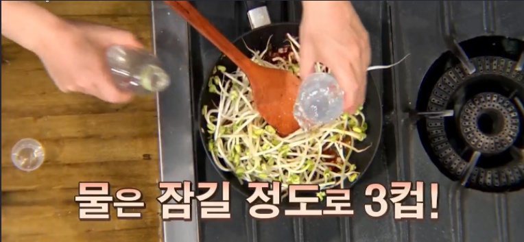 고춧가루를 넣고서 볶아주다 보면 훈연의 향이 나면서 혹시 타는 게 아닌가 하는 느낌이 드는 순간이 온다. 그러면 미리 손질해 놨던 콩나물과 물을 넣고 끓여주면 된다. 이때 물의 양은 콩나물이 간신히 잠기는 정도가 좋지만 찌개가 아닌 국으로 즐기고 싶다면 콩나물이 완전히 잠기도록 넣어주면 된다. 하지만 파기름으로 인해서 느끼한 느낌이 들 수도 있으니 감당 가능한 분만 국으로 도전해 보기를 바란다.