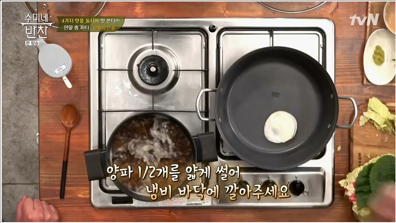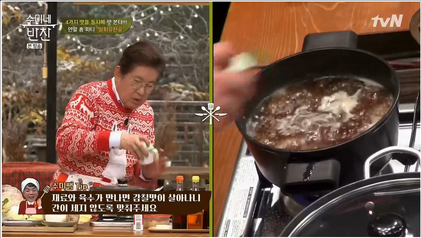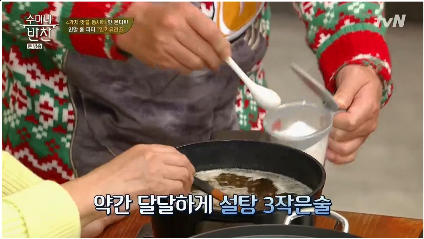 수미네 반찬에서는 밀푀유나베 레시피의 양념재료로 다진 마늘 1큰술, 후춧가루 약간, 양조간장 2큰술, 설탕 1큰술을 사용한다. 그러면서 간이 부족한 경우에는 소금으로 간을 더하면 된다. 그리고 필자의 경우 이 양념종류와 더불어 새우젓 1큰술을 더하고 설탕은 빼는 편을 더 좋아한다. 기본적으로 설탕이 주는 감칠맛은 무시할 수 없지만 기본적으로 짠맛을 베이스로 하며 고기에서, 그리고 양파와 간장에서 충분한 단맛과 감칠맛이 우러나오니 설탕을 빼도 맛에는 큰 차이가 없다. 오히려 새우젓이 주는 풍미가 고기의 감칠맛과 더욱 잘어울린다.