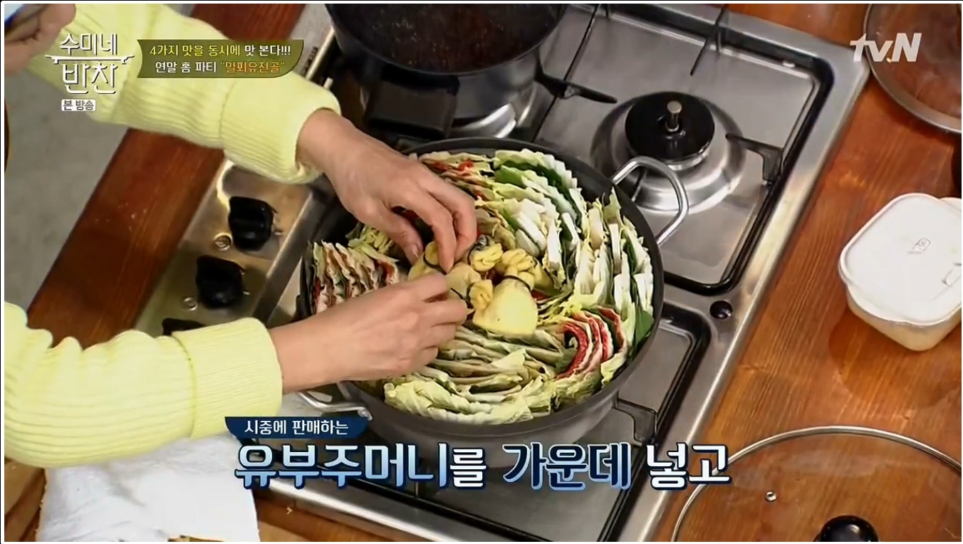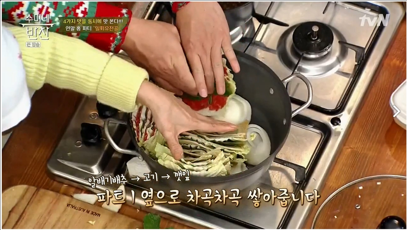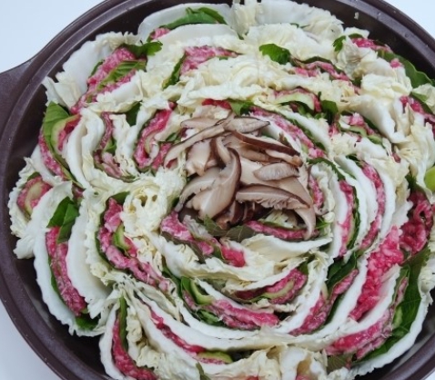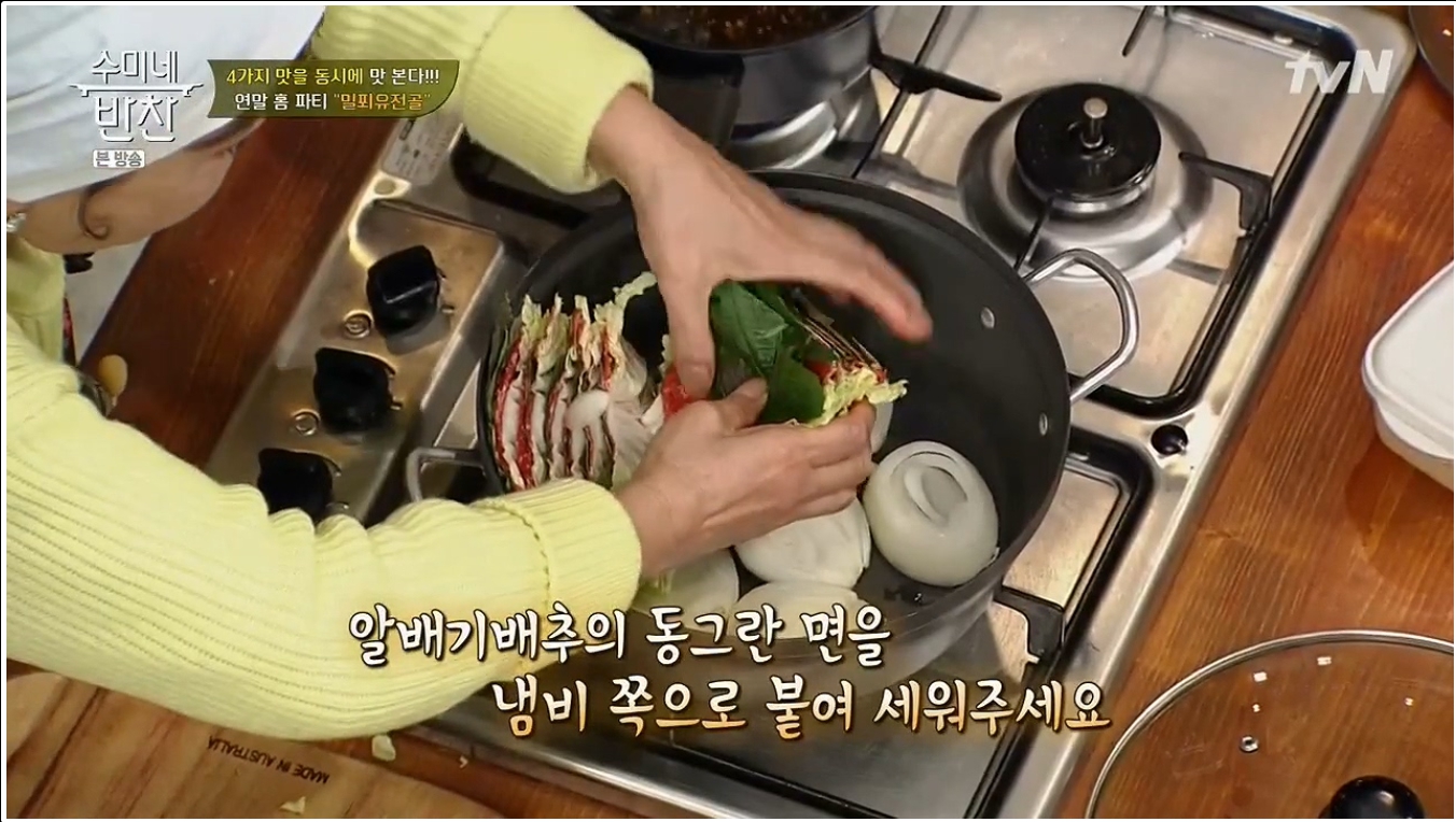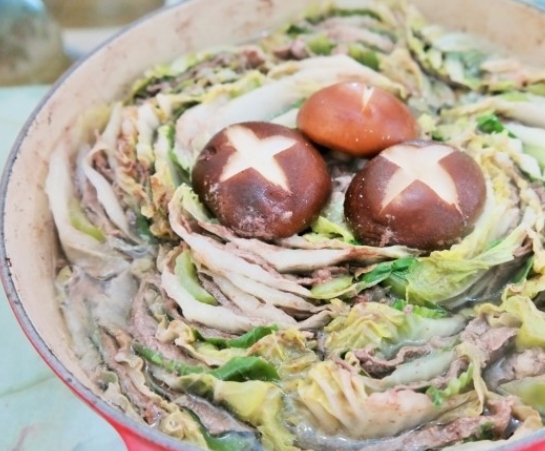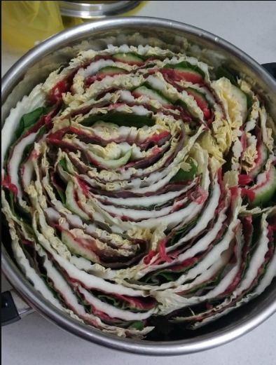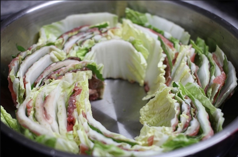 모양을 잡아 놓은 6층짜리 배춧잎들은 반을 잘라서 양파가 바닥에 깔려진 냄비위에 가운데를 중심으로 소용돌이치는 형태로 차곡차곡 넣어주면 된다. 그럼 보통 냄비의 크기에 따라 다르겠지만 아운데에 일정 공간이 나타날 것이다. 여기에 유부주머니와 표고버섯를 올려놓고 준비해 둔 육수를 부어주면 된다. 그후 7~10분정도 끓여주면 고기 육수도 적당히 우러나오면서 채소의 숨도 적당히 죽어 있는 밀푀유나베를 맛있게 즐겨 볼 수 있을 것이다.