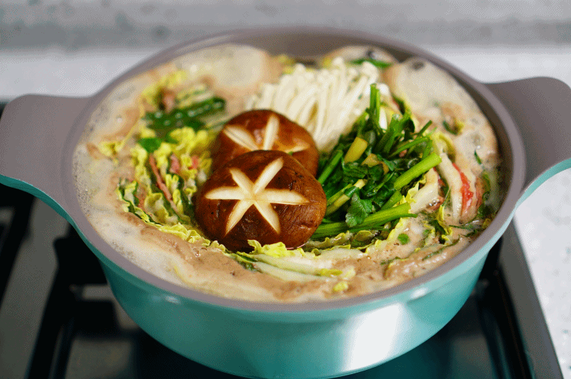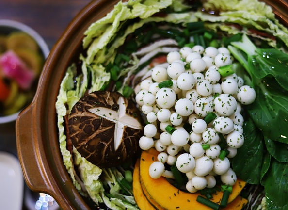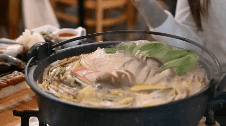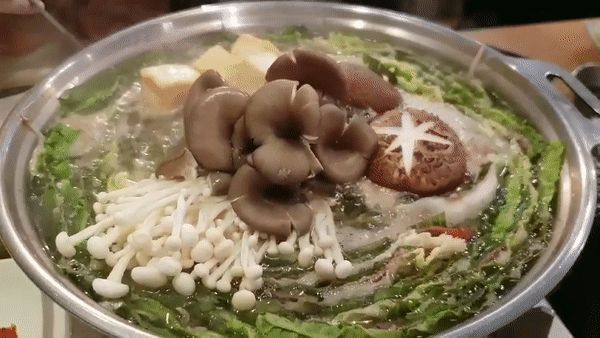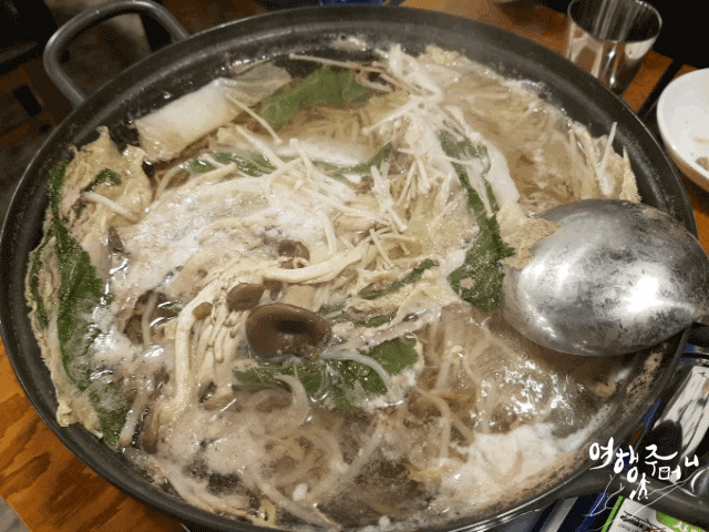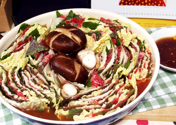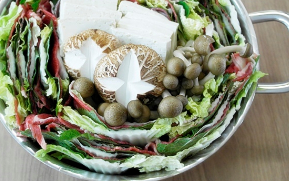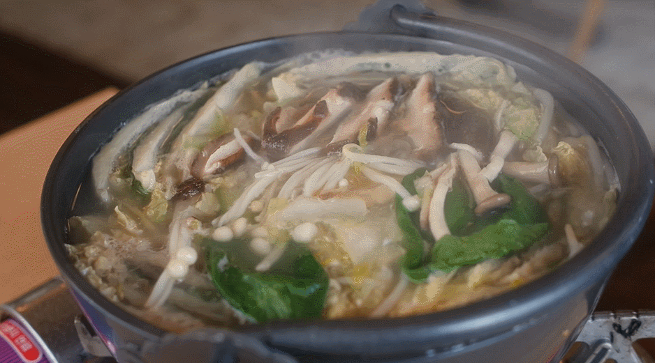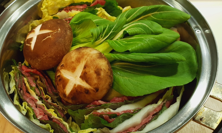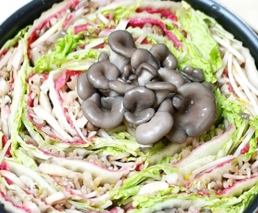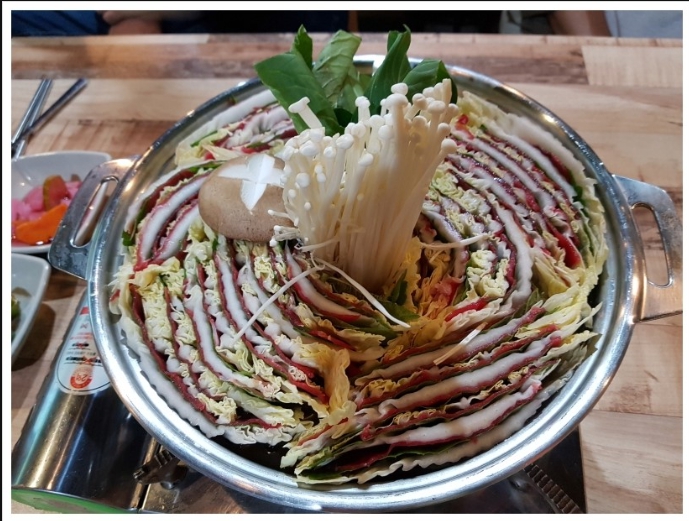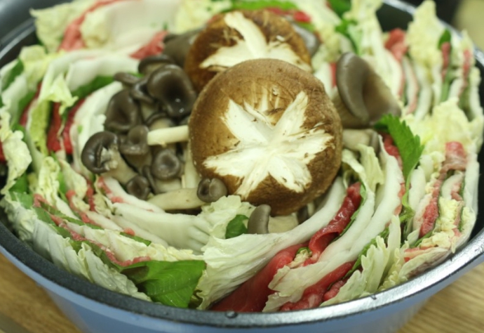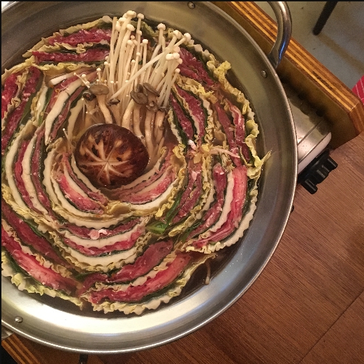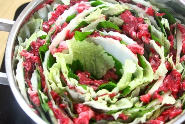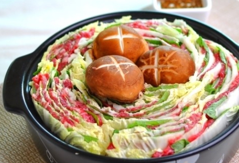 모양을 잡아 놓은 6층짜리 배춧잎들은 반을 잘라서 양파가 바닥에 깔려진 냄비위에 가운데를 중심으로 소용돌이치는 형태로 차곡차곡 넣어주면 된다. 그럼 보통 냄비의 크기에 따라 다르겠지만 아운데에 일정 공간이 나타날 것이다. 여기에 유부주머니와 표고버섯를 올려놓고 준비해 둔 육수를 부어주면 된다. 그후 7~10분정도 끓여주면 고기 육수도 적당히 우러나오면서 채소의 숨도 적당히 죽어 있는 밀푀유나베를 맛있게 즐겨 볼 수 있을 것이다.
