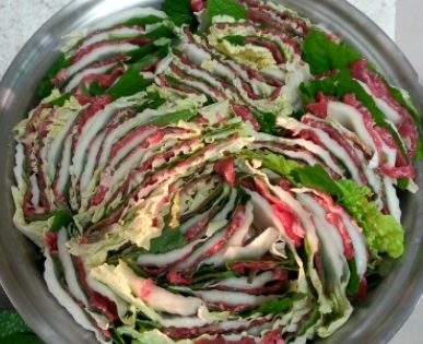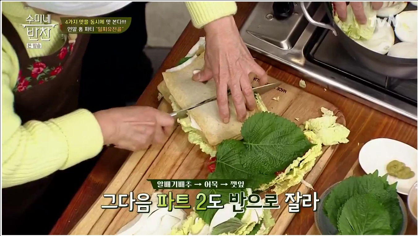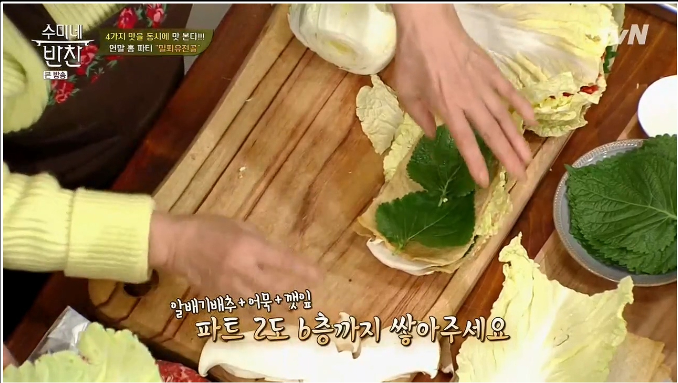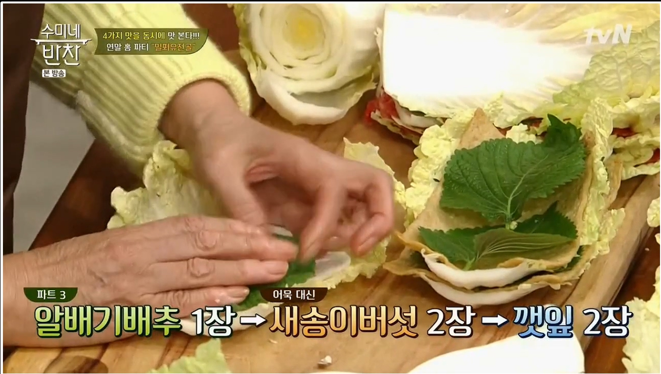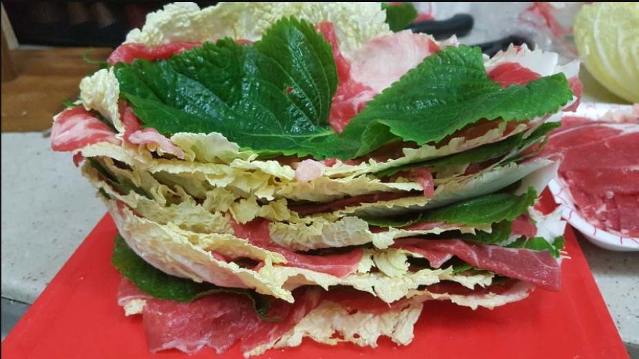 육수를 불에 올려놓았다면 밀푀유나베 레시피의 핵심인 각 재료의 모양을 낼 차례이다. 우선은 손질된 배추의 뿌리 부분과 꼭지 부분을 잘라서 평평하면서도 넓은 형태로 잡아준다. 그 후 고기와 깻잎이 올려진 배춧잎을 반복적으로 쌓아 주면 된다. 개인적으로는 고기 두장과 깻잎 두장이 딱 적당하다고 생각이 든다. 그렇게 6층정도를 쌓아주면 충분하다. 어묵과 새송이 버섯도 마찬가지로 배춧잎 위에 어묵과 깻잎을, 넓적하게 편을 썰어 놓은 새송이 버섯과 깻잎을 차곡 차곡 쌓아서 각각 준비해주면 된다.