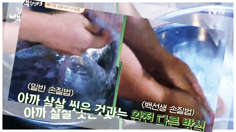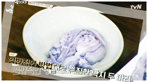 백종원 쭈꾸미볶음의 과정에 들어서면 우선 쭈꾸미 손질이 선행되어야 한다. 준비한 500g가량의 쭈꾸미를 굵은 소금으로 세척, 그 후 밀가루로 한번 더 세척해 깨끗한 쭈꾸미를 준비해준다. 그리고 만약 손질되어 있지 않은 쭈꾸미를 준비했다면 머리쪽에 있는 내장을 제거해 준다. 시중에서 판매하는 것들중에 손질되어 판매되는 상품들이 많으니 굳이 귀찮은 과정 감수하지 말고 손질된 걸로 사오자. 쭈꾸미를 세척할 때 빨판을 유의해서 딱아줘야 한다. 이부분에 모래나 이물질이 많기 때문이다.