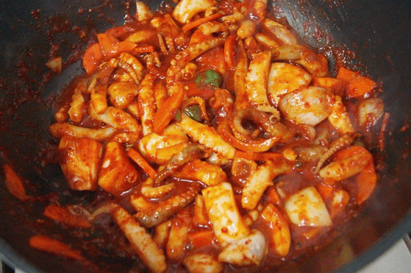 파기름에 채소까지 담아둔 냄비에 쭈꾸미와 양념을 넣고 볶아주면 된다. 이미 한번 데친 후라 양념을 골고루 입힌다는 느낌으로만 마무리를 해주면 된다. 너무 많이 볶게 되면 질감도 찔겨질 뿐더러 쭈꾸미가 쪼그라들면서 작아질 수도 있기 때문에 적정선의 수준이 참으로 중요하다. 밥반찬으로도 술안주로도 좋은 쭈꾸미 볶음이니 한번 레시피를 이용해 보길 바란다.