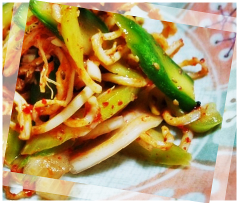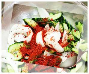 이렇게 준비된 재료와 양념을 버무려주기만 하면 된다. 오이의 특성상 잘 부러지니 너무 세게 버무려 주면 안되고 힘조절을 하면서 버무리기 바란다. 물론 오이가 소금에 절여지면서 조금은 흐물해지기는 하지만 약간의 절임시간만 가진터라 그 식감에는 큰 차이가 없을 것이다. 그러니 조심스럽게 머무리는 것이 좋다.
