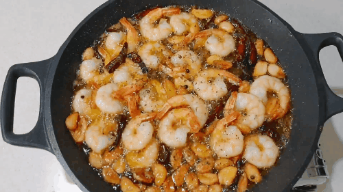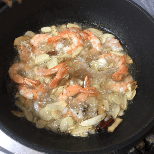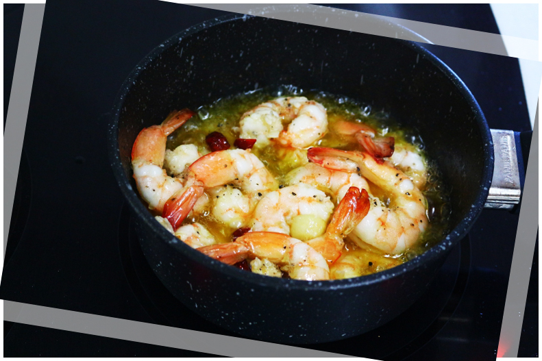 그다음으로 팬에 준비한 올리브유 200ml를 붓고 뜨겁게 가열시키도록 하자 많이 뜨거울 필요는 없고 마늘을 넣었을 때 살짝 튀겨지듯이 익혀질 정도로 가열을 시켜주면 된다. 온도가 충분히 올랐다면 마늘을 먼저 넣고 익혀주면서 마늘의 향이 골고루 퍼지도록 해주자. 마늘이 노릇노릇하게 익었다면 밑간을 해뒀던 새우와 페퍼론치노를 넣어서 익혀주면 된다. 이 때 매운게 싫다면 페퍼론치노를 빼도 상관없지만 여기서 페퍼론치노는 매운맛을 더한다기보다는 약간의 칼칼함을 더해서 느끼함을 잡아주는 역할을 한다. 만약 건고추가 있다면 대신사용하면 된다.