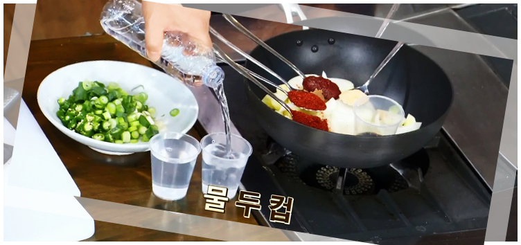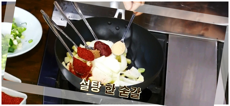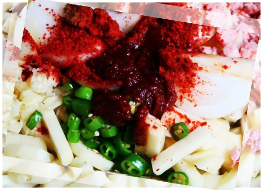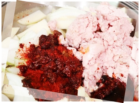 양념도 간단하게 만들어볼 수 있다. 고춧가루, 다진마늘, 고추장, 된장, 진간장, 설탕을 앞서 언급했던 계량대로 모두 한데 넣어서 섞어준다. 뭐 굳이 섞을 필요는 없고 1차적으로 끓여주고 있는 냄비에 바로 넣어주면 된다. 양념의 계량이 감자짜글이찌개의 맛을 좌우할 만큼 중요한 건 아니니 어느정도의 기본적인 계량만 지켜주면 된다. 어차피 감자짜글이찌개의 맛은 스펨에 의해 좌우된다. 설탕만 조금 기호에 따라서 조절해 주면 된다.